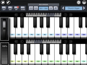 A pitch / modulation wheel and swell pedal can be optionally displayed over the keyboard to add extra emphasis to the recording. This is configurable in the App Settings screen. Changes made to pitch and modulation will be recorded into the song. Note that pitch has no effect on the Piano or Electric Piano instruments, and modulation has no effect on the Piano.